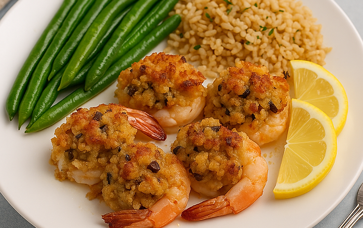 6) In 4 oven-safe bowls, melt 1/4 stick butter in each, add garlic powder, then place 5 shrimp in each bowl. Top with stuffing.